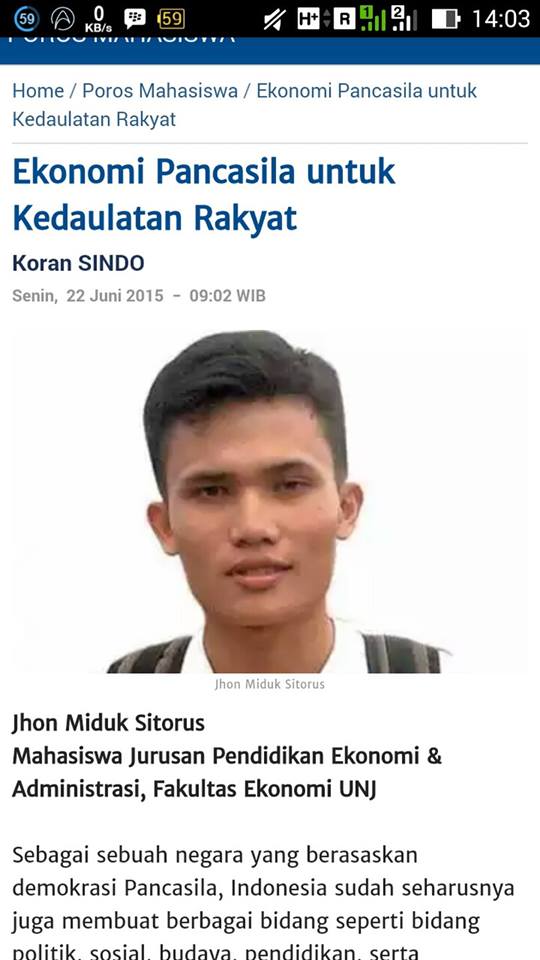 Setelah gue buka imagesnya, gue kaget, kok ada foto ini? perasaan foto ini belum pernah gue up-load di blog gue, trus ini dari mana? Gue taro kursor smartphone gue di foto itu, ternyata dibawahnya ada tulisannya Sindo. Koran Sindo, ya Koran Sindo yang sering di TV sama dibaca-baca orang. Koran ini termasuk salah satu yang terbaik kredibilitasnya. Gue kyaknya masih kurang percaya, tapi gue ingat kalo gue pernah ngirim tulisan gue 2 hari yang lalu. Kepala gue rasanya makin besar, jantung gue berdetak keras banget kayak lari 100 meter, gue sepertinya senang banget, gue ga karuan. Gue klik gambar itu, ternyata benar, ada gambar gue, Jhon Miduk Sitorus, Pendidikan Ekonomi & Administrasi, Fakultas Ekonomi UNJ dengan judul Ekonomi Pancasila untuk Kedaulatan Rakat.
